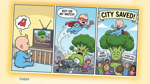- Prompt: “Make a 3-panel comic strip about a baby who becomes a superhero and saves a city from a big piece of evil broccoli.”